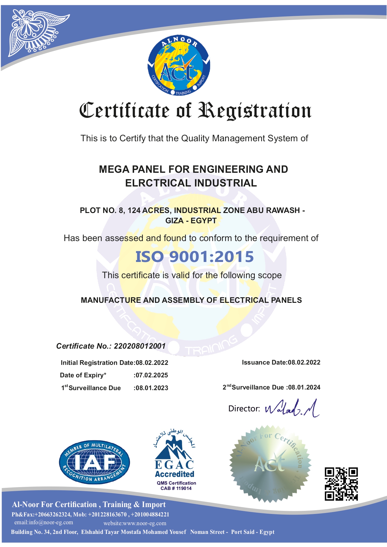 - كما بذلنا جهودنا في تصنيع اللوحات الكهربائية على اكمل وجه قد حصلنا على الشهادة من ISO 9001